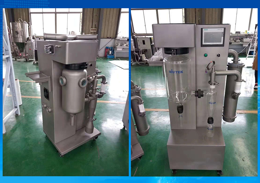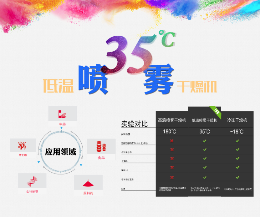 喬楓的低溫噴霧干燥機(QFN-DW系列噴霧干燥機可實現35度到100度范圍內)可實現連續35°C低溫噴霧干燥機,回收率高.保留物料活性。該設備對溶液如乳濁液、懸浮液具有廣譜適用性, 適用于對熱敏感性物的干燥如生物制品、生物農藥、酶制劑等,因所噴出的物料只是在噴成霧狀大小霧滴時,才受到干燥風系統,故只是瞬間受熱,能保持這些活性材料在干燥后仍維持其活性成份不受破壞。該型噴霧干燥機可以實現在常溫下進行噴霧干燥的低溫霧化干燥機。